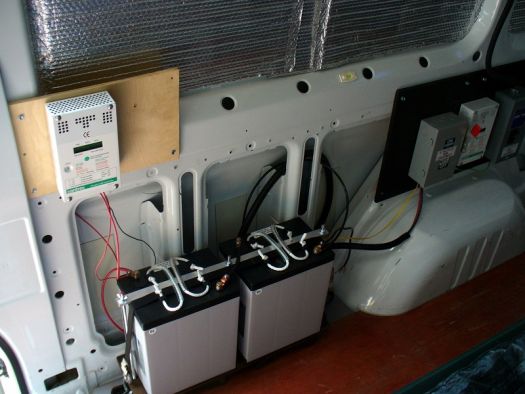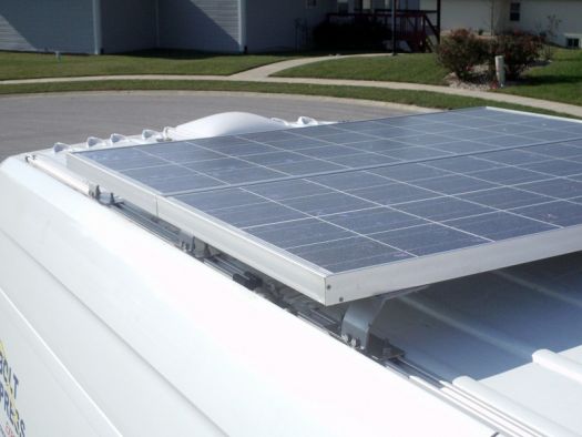 The power for charging the batteries come from two Mitsubishi PV-EE125MF5F panels on the roof of the van. Each panel is rated at 125 watts, 17.3 volts and 7.2 amp output. I cut those numbers roughly in half to give me an idea of what I get in a real world application. The electricity going into the batteries from the panels is controlled by a second Xantrex C35 set up as a charge controller. My C35 is a three stage charger with a battery temperature monitor, so the charge going to the battery is precisely regulated according to the current condition of the batteries. Winter is the hardest time to keep the batteries fed, but with close management, I keep things running. In the winter, I also assist the solar panels by running a line off the starter battery through a battery isolator and to the auxiliary batteries. When the vehicle is running the battery isolator allows power from the alternator to help charge the auxiliary batteries. In an ideal world I would add a couple extra batteries, but at 96 lbs a piece batteries get heavy, fast. In the summer I disconnect the line to the alternator to keep from overcharging the auxiliary battery bank. I mounted the panels about five inches off of the roof to keep heat from building up under the panels, because excessive heat reduces the efficiency and lifespan of solar panels. I lose about one mpg to the turbulence of the raised panels, but I’ll live with that. I could install a wind deflector, but at this point in time, it probably won’t happen until I’m installing a new system on a new vehicle. The next vehicle may even get an extra panel, since 26 lbs for one panel is a manageable number.